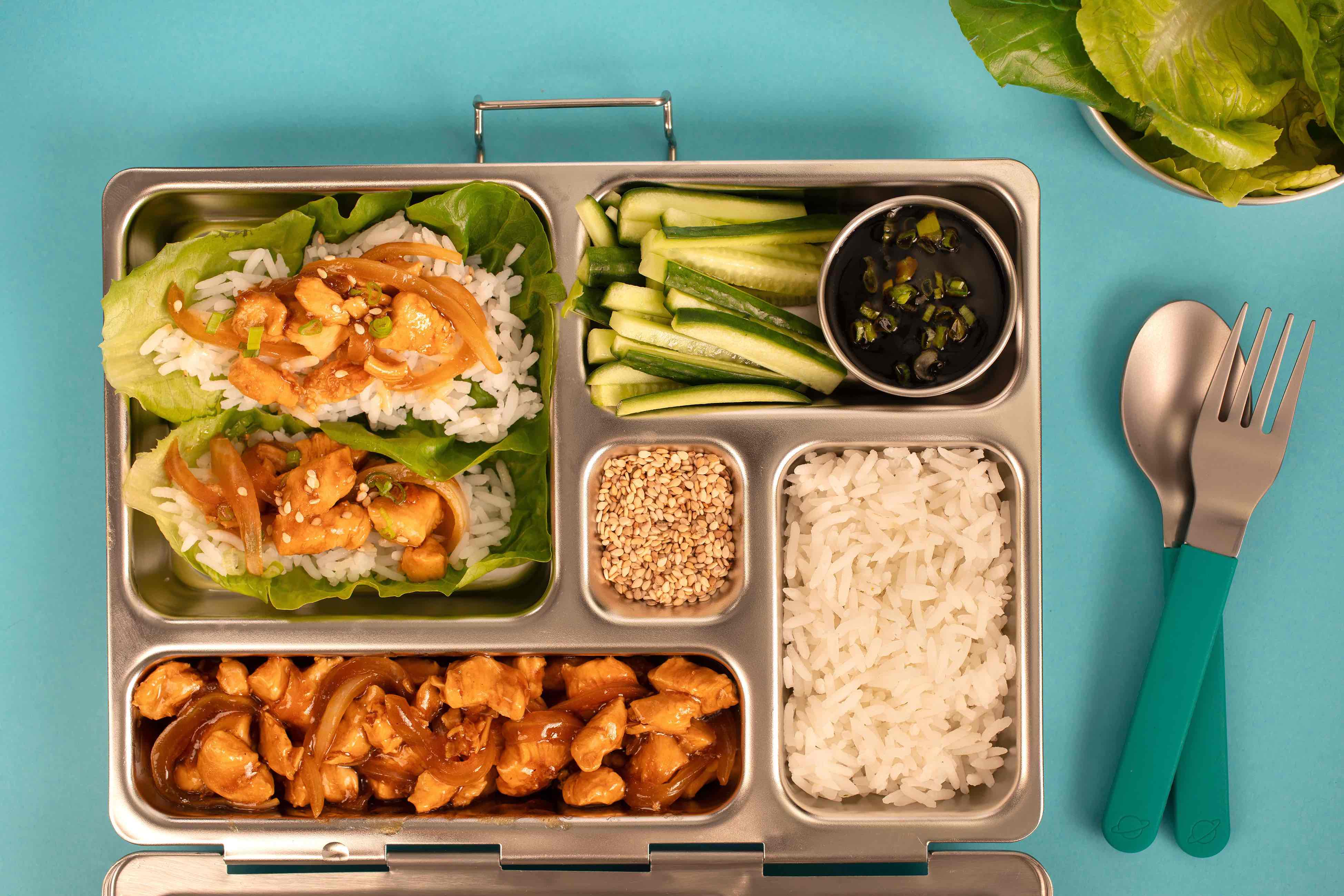 Teriyaki de res con arroz sobre hojas de lechuga